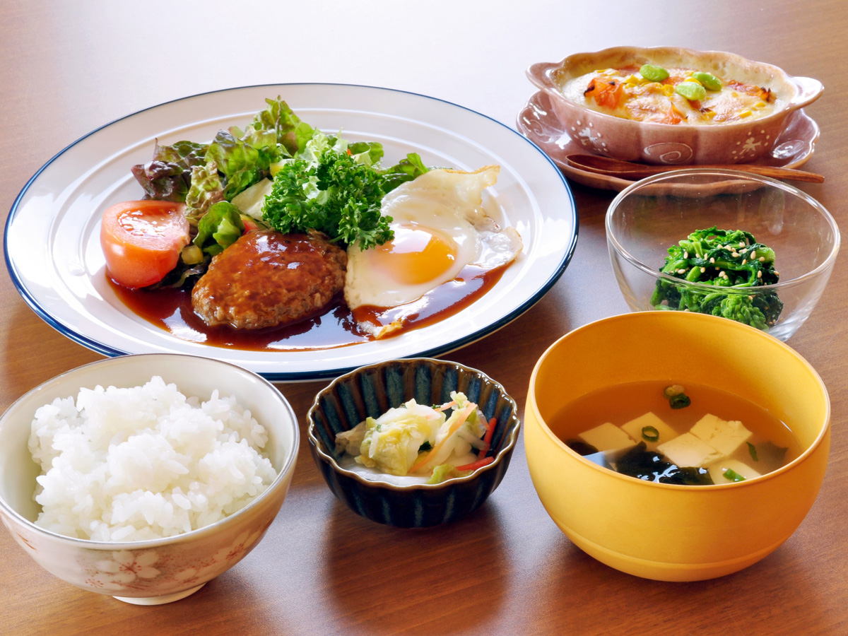 ご朝食は地元で採れた新鮮な野菜を使用したおかずを中心に、バラエティに富んだ日替わりメニューの定食形式でご提供いたします。